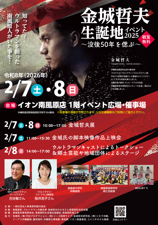 2026年2月7日(土)・8(日)開催予定、金城さんの人柄や制作秘話を語るトークショーや地域団体によるステージをお楽しみいただけます。ふるさとの地で、金城さんの精神と情熱を感じられる特別なひとときをお見逃しなく。
