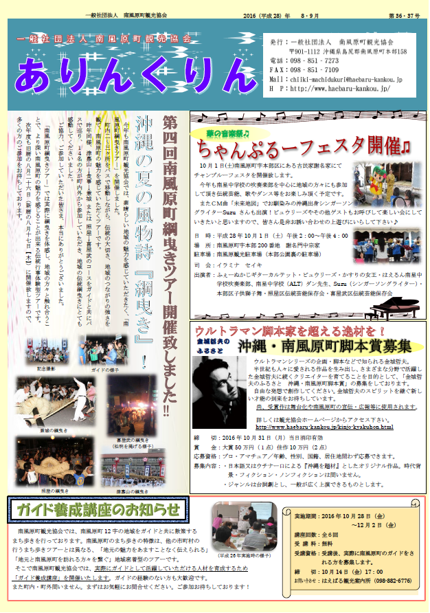今回は、10月に行われるチャンプルーフェスタやかすりの道ツアー、津嘉山ツアー、ガイド養成講座、民泊講習会など催し物が盛りだくさん♪